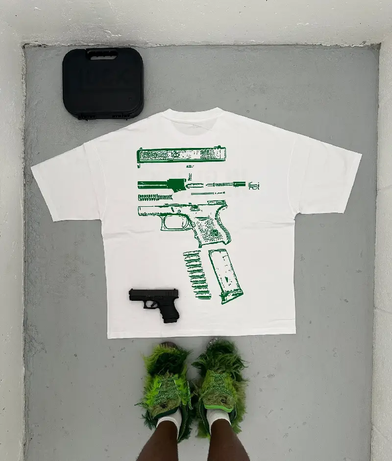 The In Glock We Trust Oversized T-Shirt White/Green is crafted for those who live boldly and dress effortlessly. Its relaxed fit offers a laid-back streetwear vibe, while the crisp white base and striking green design add a touch of edge to any outfit. Soft, breathable cotton keeps you cool whether you’re out on the block or chilling with friends. Perfect for layering or wearing solo.